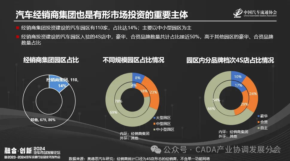 郎学红表示,汽车经销商集团是有形市场投资的重要主体。目前,全国范围内由经销商集团投资建设的汽车园区已达110家,占整体汽车园区的比例达到14%,且主要以中小型园区为主。值得一提的是,经销商集团投资建设的汽车园区内豪华品牌与合资品牌的数量合计占比接近50%,这一比例明显高于其他类型园区的相应品牌占比。
