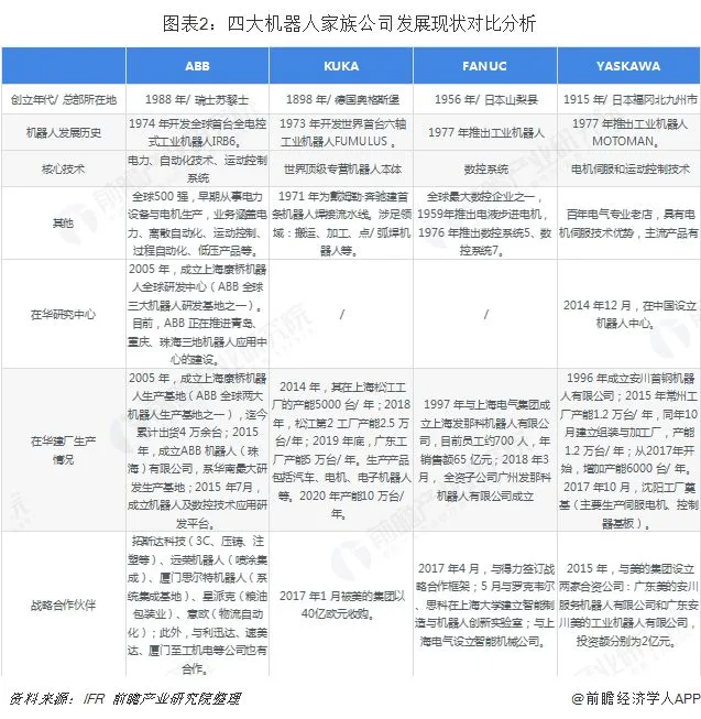 工业机器人四大家族:ABB、发那科、库卡、安川电机最初起家是从事机器人产业链相关的业务,如ABB和安川电机从事电力设备电机业务、发那科从事数控系统业务,库卡一开始则从事焊接设备业务,最终他们成为全球领先综合型工业自动化企业,他们的共同特点是掌握了机器人本体和机器人某种核心零部件的技术,最终实现一体化发展。