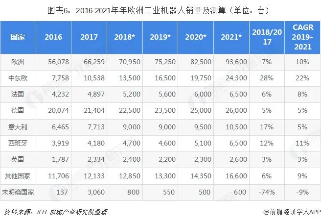 意大利机器人销量比2016年增加19%,达7713台。2017年,法国机器人市场持续上升,其机器人销量增加16%,约为4900台;西班牙机器人销量约为4200台,创历史新高。