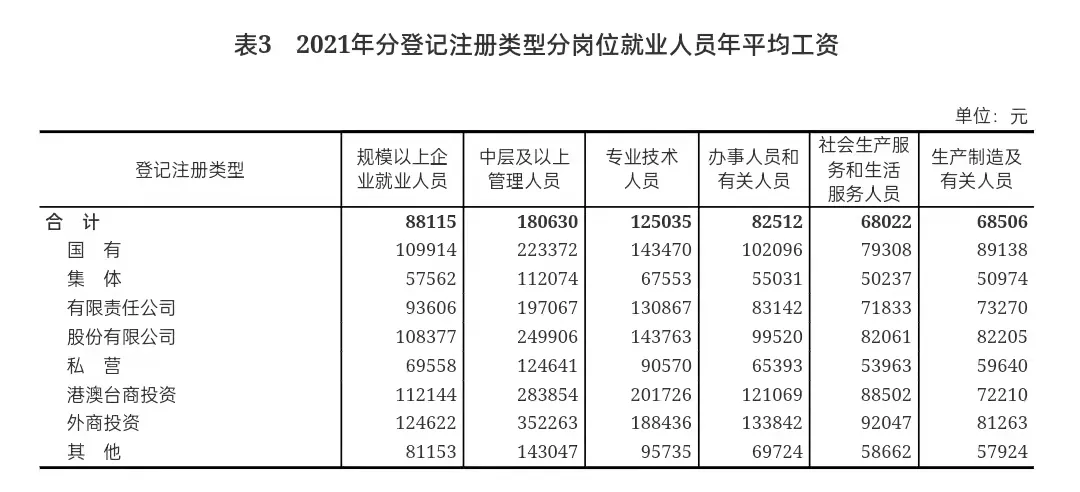 中层及以上管理人员平均工资最高,是全部就业人员平均水平的2.05倍;