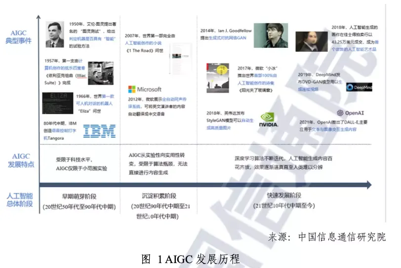中国信通院认为,AIGC 的发展主要经历了三个重要阶段:早期萌芽阶段(1950s-1990s)-沉淀积累阶段(1990s-2010s)-快速发展阶段(2010s-至今)。