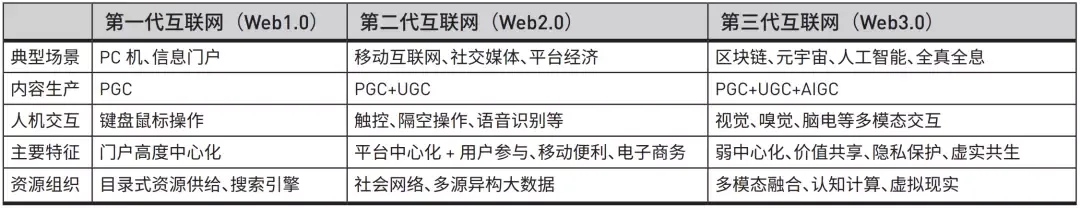 从网络形态来看,第一代互联网(Web1.0)以个人电脑、信息门户和文件传输协议(FileTransferProtocol,FTP)为典型场景;第二代互联网也被称为Web2.0,以移动互联网、社交媒体和平台经济为典型场景;第三代互联网目前被称为Web3.0,以区块链、元宇宙、人工智能、全真全息为典型场景。