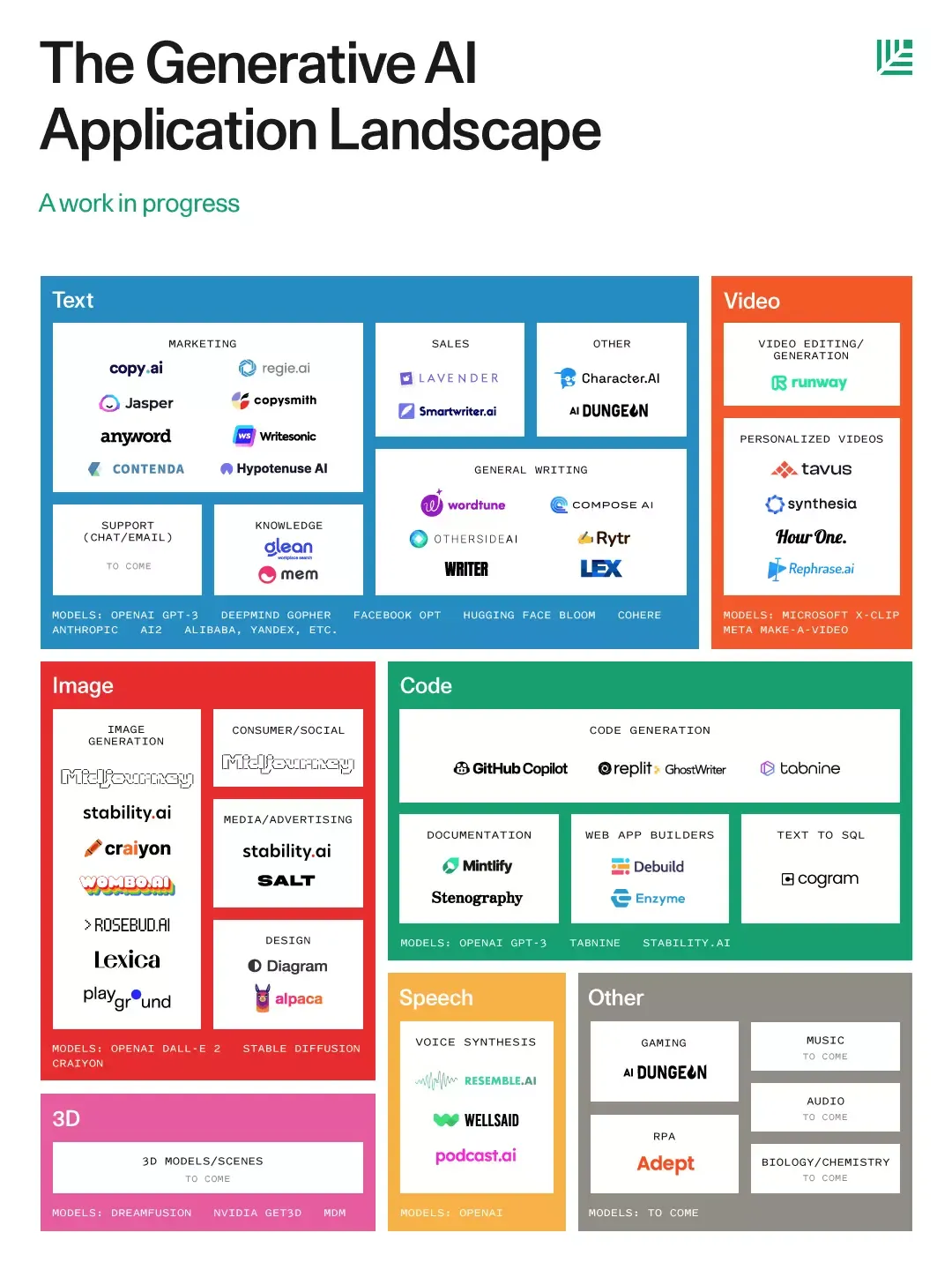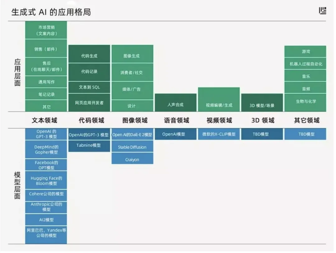 红杉资本的两位合伙人 Sonya Huang 和 Pat Grady 几个月前曾发表了一篇名为《Generative AI: A Creative New World》(生成式 AI:一个创造性的新世界)的文章,里面提到 AIGC 的应用格局,主要分为文本领域、代码领域、图像领域、语音领域、视频领域、3D 领域等。