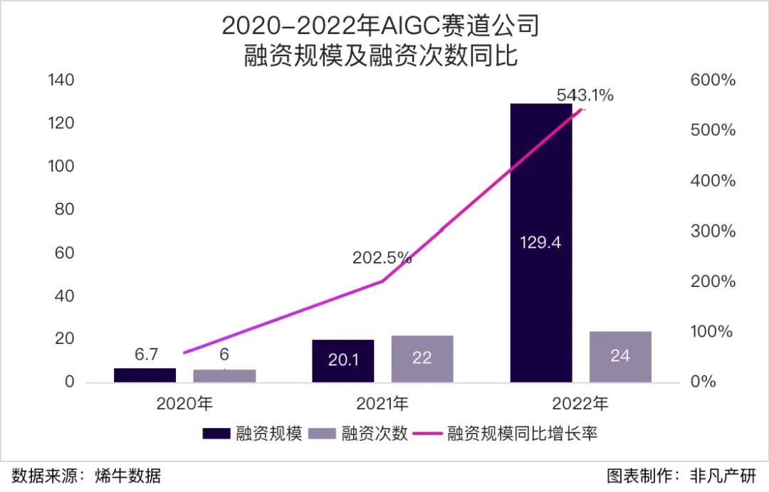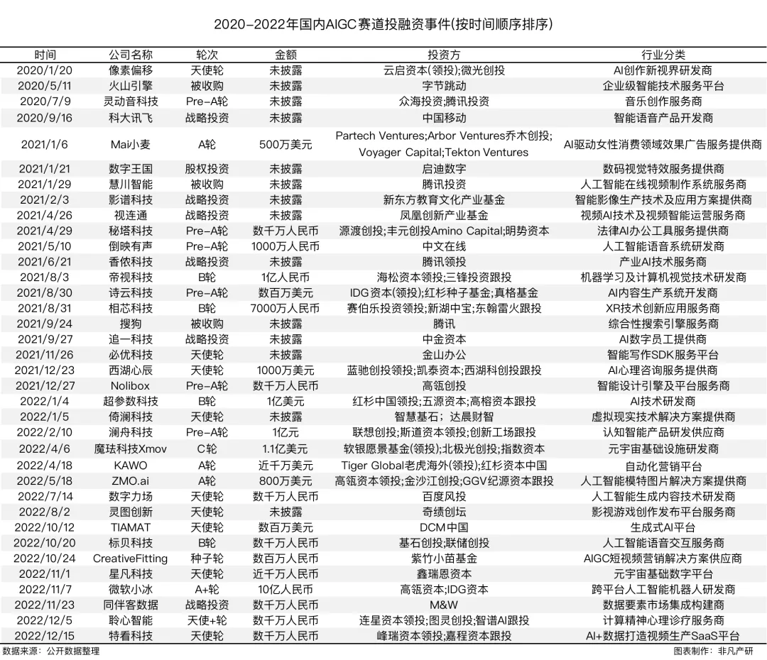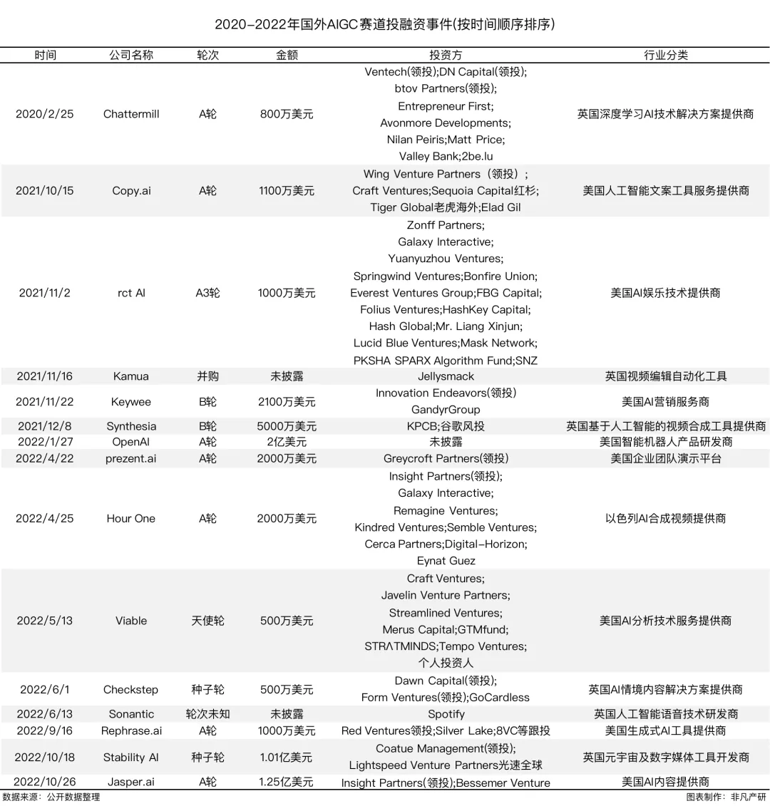 慧川智能,是一家人工智能在线视频制作系统研发商,用户只需要输入脚本文字,就可以直接通过云端生成相应的视频内容,自动配音,并且用户可以在线进行编辑和修改,同时预览、渲染、视频文件导出和下载等全部能在平台云端完成。在2016-2021年期间,完成4轮融资,分别来自纪源资本、清流资本、头头是道基金、腾讯投资,共完成数千万人民币的融资,最新于2021年1月29日被收购。思必驰,是一家智能语音技术解决方案提供商,基于语音识别、语音合成、语义对话及语义唤醒等技术,致力于提供自然语言人机交互解决方案,应用于智能车载、智能家居和智能机器人领域,旗下开发有“会话精灵”,可应用于企业服务、教育服务、政府服务等市场领域。在2012-2020年期间,完成8轮融资,并且于2020年8月27日完成Pre-IPO轮融资,2012年起获得的融资分别来自联想之星、荷塘创投、新凤祥光明投资管理有限公司、阿里巴巴、元璟资本、元禾控股、中民投、深创投、富士康、联发科、睿薪投资 、聚安投资、国调国信智芯领投、北汽产投、中信金石、上海五信投资管理、明善资本、斐翔投资、境成投资、君子兰资本、珠海大横琴、美的资本、菡源资产、中信证券、元禾控股、清控银杏、致道资本、佳都科技、花城创投等,共获得约15亿及以上的融资。国外AIGC赛道企业中,获投较多的如下: