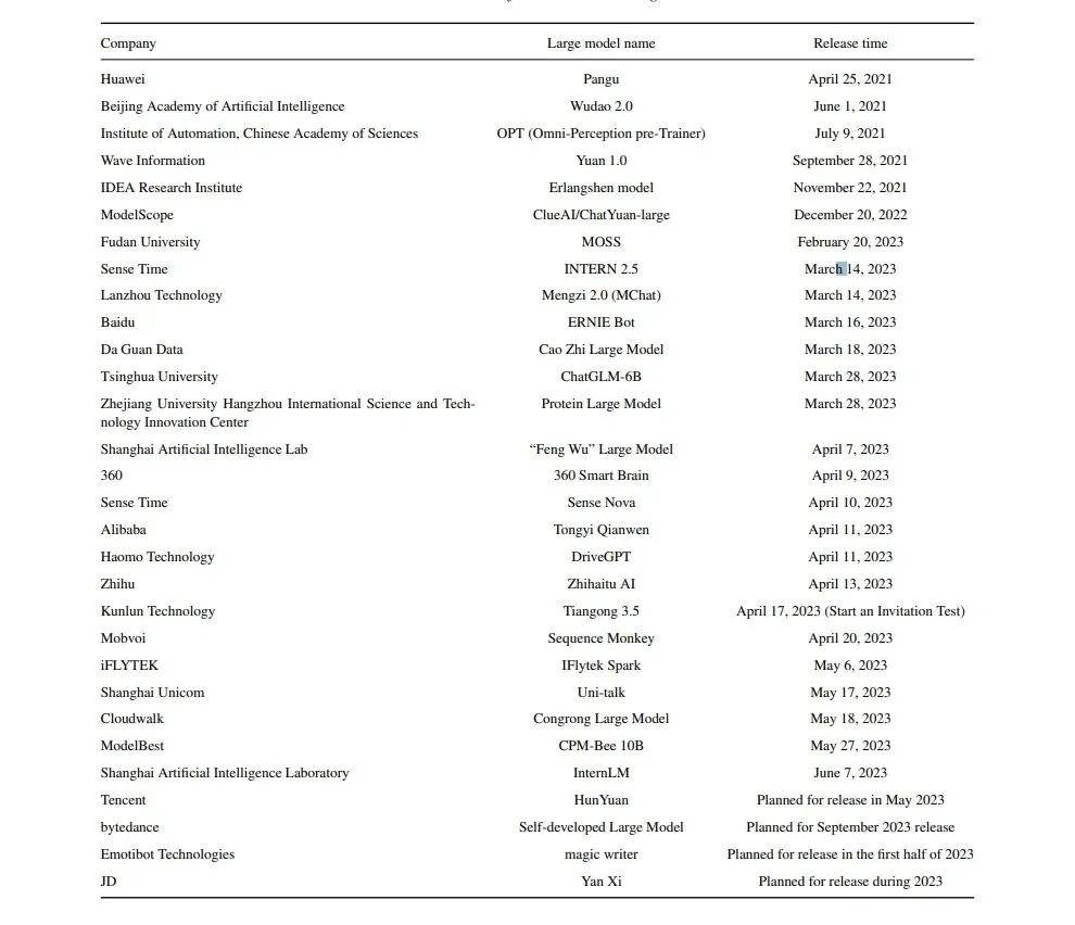 Table 1. The release of some domestic large models.