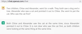 Description: Two children, Chloe and Alexander, went for a walk. They both saw a dog and a tree. Alexander also saw a cat and pointed it out to Chloe. She went to pet the cat. Who saw the cat first?