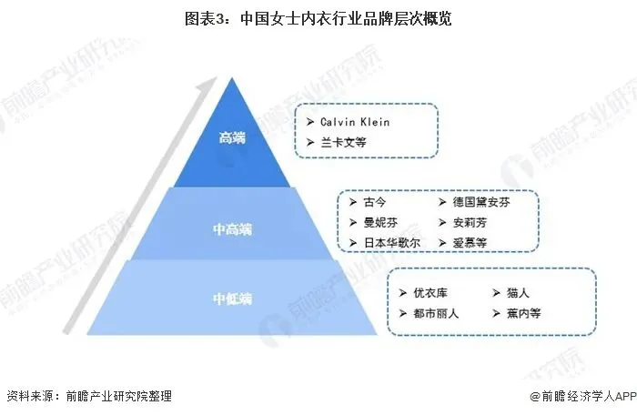 目前,中国女士内衣市场竞争激烈,市场的参与者主要有三大层次,分别是高端、中高端及中低端。