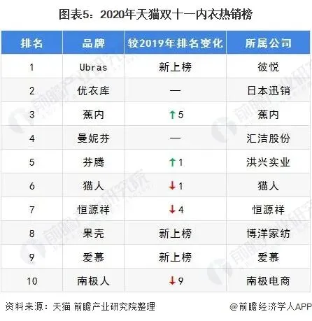 从女士内衣品牌来看,根据天猫公布的2020年天猫双十一内衣热销榜,我国女士内衣行业电商销售前十品牌分别为:Ubras、优衣库、蕉内、曼妮芬、芬腾、猫人、恒源祥、果壳、爱慕、南极人。在电商渠道,中低端女士内衣品牌及新兴品牌获得了快速成长,如Ubras、优衣库、蕉内等品牌。