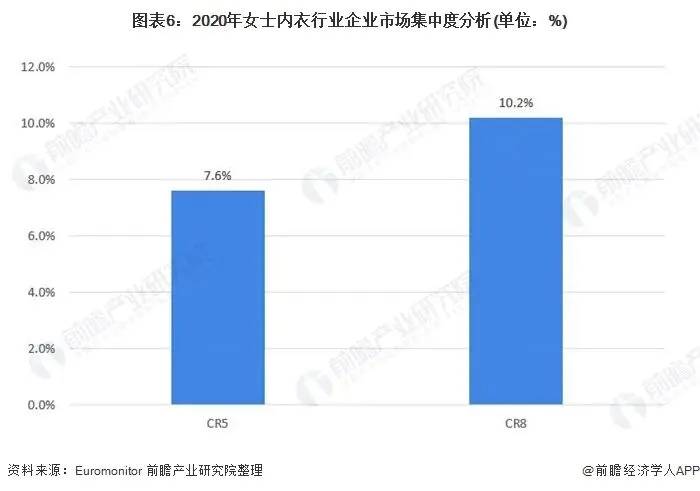 目前,中国女士内衣行业的市场集中度较低,产品竞争较为激烈。据Euromonitor数据,2020年,中国女士内衣行业CR5的市场份额合计为7.6%,CR10的市场份额合计为10.2%,市场集中度较低。