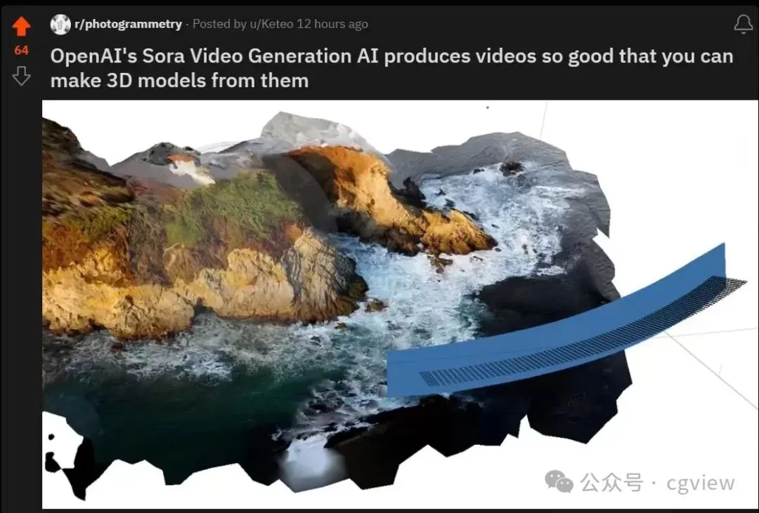 在过去的一年里,AIGC图片生成式内容很火,我们看到使用 Stable Diffusion、Midjourney和 Dall-e 等平台的 2D 图像生成的 AI 工具取得了巨大发展,并且采取订阅制商业上也相对成熟快速落地。这些文本到图像的 AI 工具可在几秒钟内将文本提示转换为详细的图像。最传统概念设计师的影响显然是最大的,图片毕竟是静态,技术门槛还是比较低的。来探讨一下AI视频的进展,Sora显然是关键的技能树解锁之一。像 GPT的文本生成是 Transformer 模型,简单说它是一套使用神经网络编码和解码的文本预测架构,将文本编码成数据向量,然后解码的时候从数据还原出文本,来预测上下文。 有了文本生成模型后,通过卷积神经网络让文本和图像关联。文生图是怎么到视频生成模型转变的?Runway、Stable Diffusion 是基于扩散模型(Diffusion Model),扩散模型的训练过程是通过多个步骤逐渐向图片增加噪点,直到图片变成完全2D无结构的杂乱噪点图片,然后在生成图片的时候,基于一张完全噪点的图片,逐步减少噪点,直到根据文本提示词还原出一张对应清晰的图片。这个数学过程不是非常复杂,对于有数学和机器学习基础的人看懂推导过程还是比较简单的。简单理解扩散模型之前的实现还是2D上意义的重建生成前后帧,所以很多AI视频模型动起来软绵绵的,除了抖动就是生成对象的几何模型立体表现不一致持续,这是以前方法最大的瓶颈。 Sora 和之前扩散模型的架构上最大的区别与突破呢?AI视频模型本身是一个必须需要物理和几何感知的生成模型,Sora 朝这个方向迈出了一步,稳定一致性不抖是它非常重要的进步,Sora 是基于之前的进行改进,做出了自己的 Diffusion Transformer架构,基于目前的官方报告,可以看出它不是简单的2D生图进行再连续生成,否则透视都不会那么正常。官方称物理是用数据驱动学习模拟,这更像是一种映射替换,而非具有动力学理解了物理行为,重建这一过程,注意也只是重建,这和“理解”物理行为完全不同。扩散模型是深度学习和生成模型的关键技术之一。它指的是一种生成模型,可以生成模拟给定数据分布的高质量、多样化的“样本”。在这种情况下,数据分布是一系列电影风格的真实图像。但不要混淆;它不以3D建模,不了解物理或光,也不了解相机,无论是数字还是其他方式。它生成了统计学上合理的图像,现在它可以以一种看起来在时间上一致的方式做到这一点。换句话说,这些视频似乎在帧之间没有抖动,而且随着时间的推移,它们(某种程度上)是有意义的。我们之前已经看到过许多尝试,但没有一个像SORA那样好或那么长。新的 OpenAI SORA 正在制作合理的(大部分)60 秒视频——比以前可能的时间长得多。—— Mike Seymour,fxguide联合创始人和特约编辑评论道。另外,官方报告中特地提到了:“我们的研究显示,扩展视频生成模型的规模是向着创建能够模拟物理世界的通用工具迈出有前途的一步。”报告中没有包含具体实施方法的架构详细信息。而且计算性能和成本并未说明,我认为算力目前要求不会很低,成本下降空间一切还是未知,等待大规模测试才能知道。 Sora 目前已知是一个融合不同以往的架构。Sora 不是预测序列中的下一个文本,而是预测序列中的下一个“Patch”,这肯定不是单纯的文本语义信息,而是含有语义、几何空间和物理感知数据压缩的。官方报告里面叫 Patches,Encoder 将视频压缩为低维数据,再反复编解码处理,再将其分解为 Patches。同样 Sora 也能从 Patches 反向解码生成视频图像。比如从《我的世界》游戏体素风格和写实风格的视频互相转换。为了验证Sora具备几何感知能力,也就是对提示词表达的数据对象有隐式的基础空间点云生成能力,在官方视频流出后,专业的照片建模博主对其进行的重建,可以看出Sora已经具备,否则根据其城市、室内等视频运动分析是无法复原其内容3D结构的。在下面资产章节会更加细致讨论。以下是AI视频的技术论文和项目参考,来看看历史变迁:Diffusion Transformers (DiT)