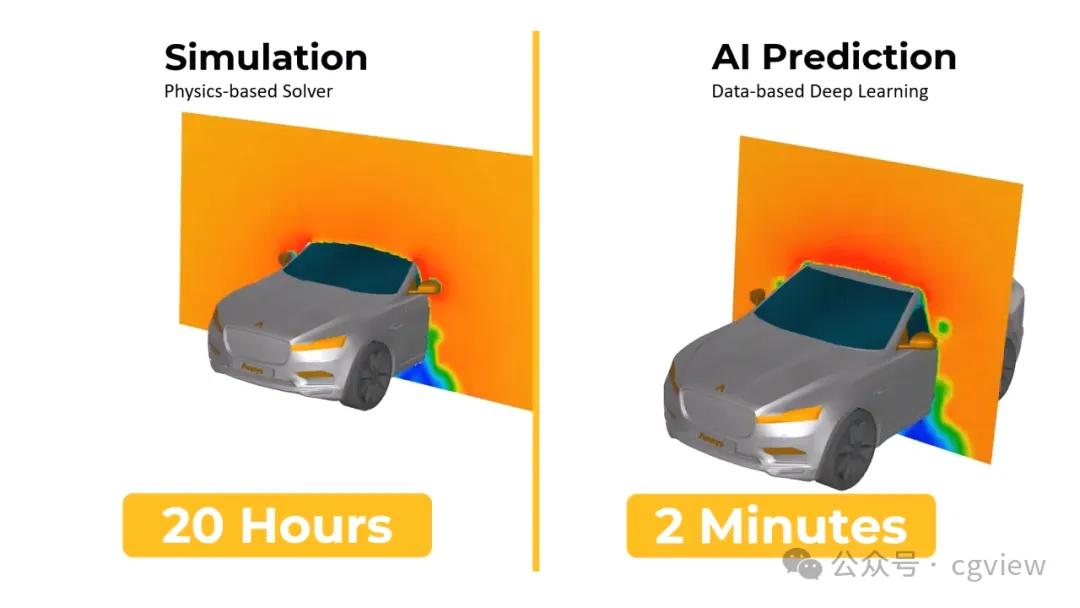 上图是Ansys SimAI云端仿真平台展示汽车的流体动力学传统与AI性能对比。工程师可以轻松可靠地以闪电般的速度预测物理行为,不止在工业界要做复杂的物理动力学模拟,VFX行业的角色动画,特效也需要大量的刚体、柔体、流体交互模拟,并且解算极其耗费时间和人力物力,这很大程度受限于底层的解算器算法难以大幅度改进,精度和速度无法同时兼顾,也受限于目前芯片计算性能。但神经网络的机器学习可以在大量数据中, 进行拟合得到很多有效近似数值解,并且满足一定尺度下的各种定律法则。所以除了工业界,各种实时特效工具在游戏和影视这方面使用中还在不断改进,足以大幅度降低模拟解算时间,从而简化工作调试流程。渲染