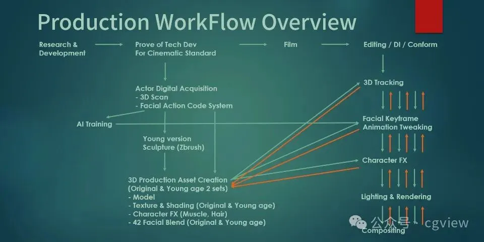 除了元宇宙数字人的概念忽悠,近年在影视行业换脸需求持续上升。影视本身就是围绕角色讲故事,如何穿梭不同时间完成不同年纪的角色表演,保证其一致性,面部的减龄增龄都离不开AI换脸,如《流浪地球2》年轻的吴京、《夺宝奇兵5》的哈里森·福特、亦或是《速度与激情7》让去世的保罗复活,更甚某演员翻车不得已而换掉的影视项目,都离不开这项技术。而AI换脸的流程贯穿这个行业的基本全线,更容易让我们从局部而反瞰全部,总览AI对于流程的渗透和改变。总部位于香港的英国视觉特效公司Big Picture Studio去年在《别叫我“赌神”》项目中,让周润发减龄,在幕后制作中展示了其关键的工作流程。很复杂吗?其实这个行业制作的全流程远比上图更复杂,更循环往复需要不断调整反馈微调,单把VFX某个环节拿出来流程也是和上图类似的,所以Sora颠覆影视行业的外行论调目前是夸大其词,实际而是像上图橙色线条一样逐步改变的。从研发阶段到测试再到最终,需要技术和制作人员密切配合,十分考验沟通和执行能力,AI在重塑这个工作流程,会有老工种消失,也会有新的高度复合要求工种出现。