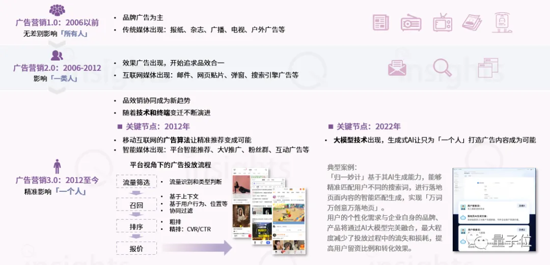 2012年移动互联网的广告算法让精准推荐变成可能,2022年大模型技术出现,生成式AI让只为「一个人」打造广告内容成为可能。