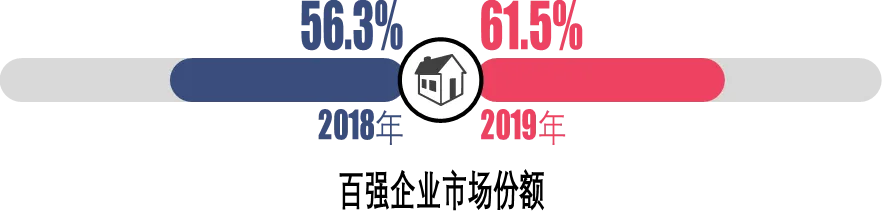 2019年,百强企业销售总额、销售面积分别达98179.3亿元、72458.3万平方米,同比增长16.3%和13.5%,销售额市场份额稳步上升至61.5%,较上年提高5.2个百分点。