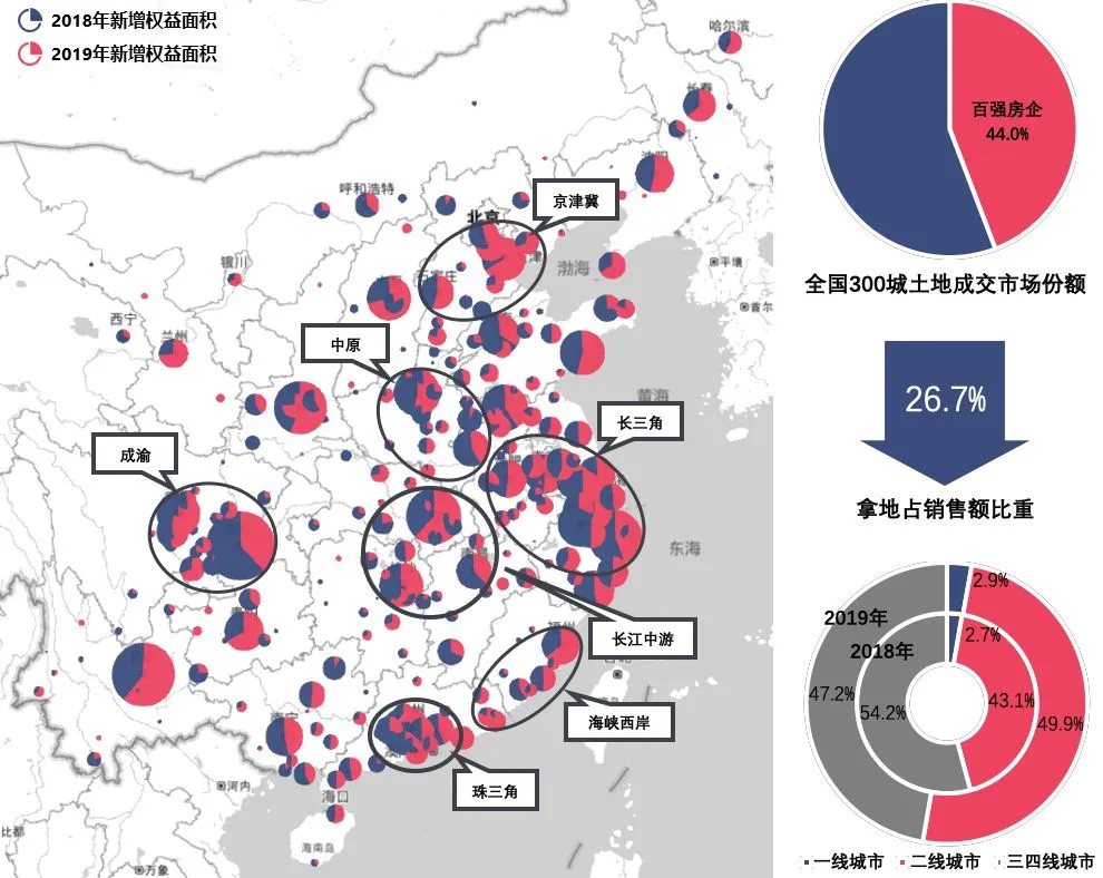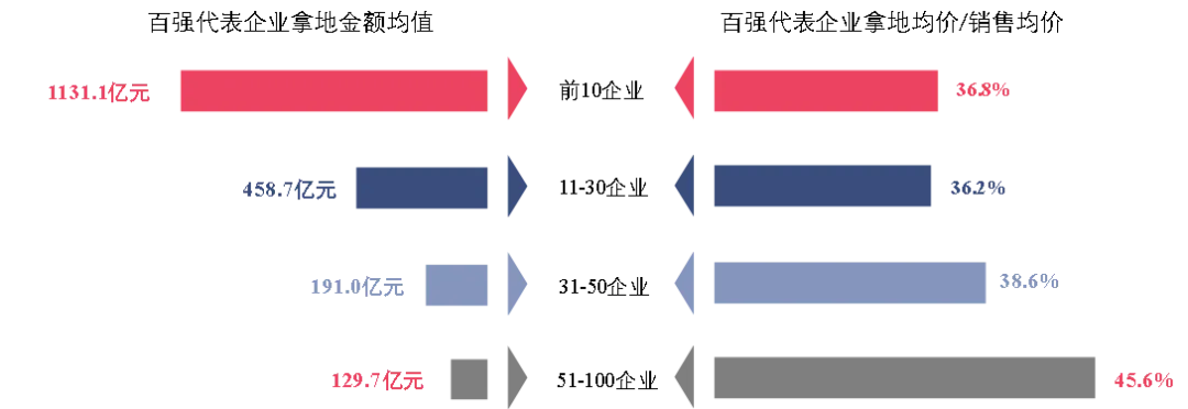 50家百强代表企业招拍挂市场的拿地金额22323.7亿元,占全国300城土地出让金的44.0%。百强企业拿地态度谨慎,拿地金额占销售额比重降至26.7%,布局回归一二线城市,一二线城市的新增土储权益面积占比52.8%,同比增长7.0个百分点。