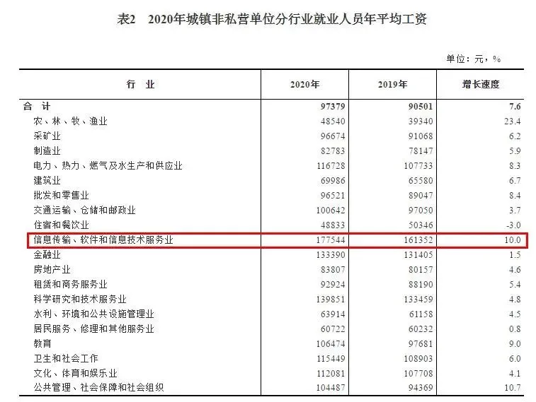 程序员们的工资也保持了高速增长。城镇非私营单位中,2020年信息传输、软件和信息技术服务业平均工资增长10.0%,比上年加快0.7个百分点,增速排第三。而私营单位中,信息传输、软件和信息技术服务业平均工资增速最高,达18.7%。