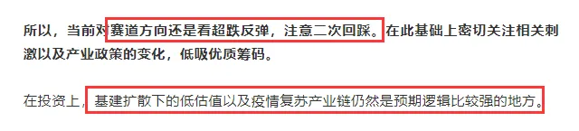 受到外围市场刺激,今天A股延续回暖趋势,但是会明显感觉今天赚钱效应要明显比昨天差。主要就是昨天赛道股的全面爆发,激活了市场人气,而赛道股是大多数投资者的持仓方向。但今天尽管指数不错,赛道股却基本上全面熄火,市场显得比较散乱。即便这样,今天依然是前面强调的逻辑方向在表演,基建股尾盘上演涨停潮,杭州园林、成都路桥、浙江建投、宁波建工等超20只个股涨停,并且基建开始向家居、建材方向蔓延。疫情复苏方向旅游调整了一天后今天接近反包。在昨天《突发,大涨!》一文中,对赛道的反弹做了解读,认为持续性还有待观察。此种情况下,再次强调了基建的低估值和疫情复苏线路。看来市场还是遵照这个逻辑在走。