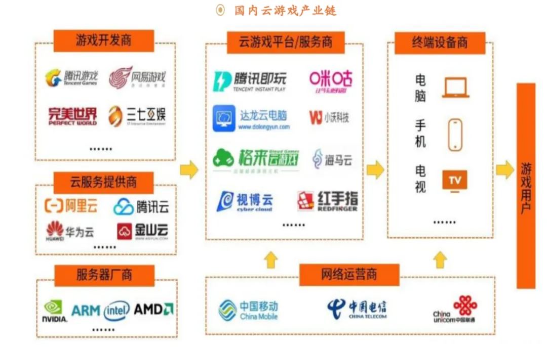 包括游戏产品研发商、云游戏分发运营平台、云游戏服务器提供商、终端设备商和云游戏推广平台等。