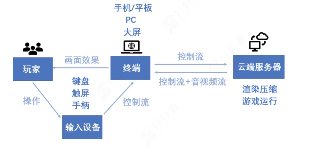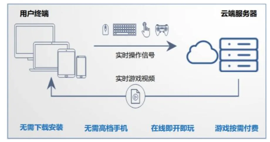 具体过程为玩家在云端服务器上拥有一台虚拟电脑,云端的游戏画面与声音通过网络传输至手机、电脑、平板等终端显示设备,玩家通过手柄、鼠标、键盘等输入设备实时控制位于云端的虚拟电脑进行游戏。