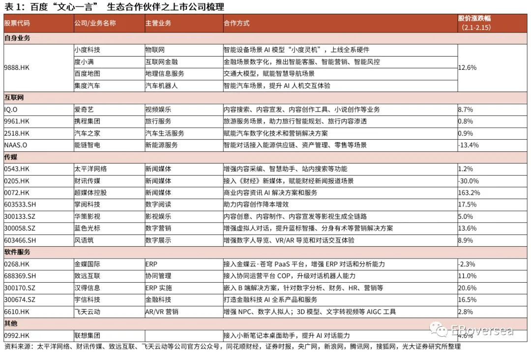 商业落地多样化赋能现有产业,AIGC有望形成较长期的主题投资。国内厂商注重AIGC与现有产品的整合,其中阿里巴巴结合钉钉办公,科大讯飞结合AI学习机。百度“文心一言”并入搜索、小度等自有业务外,积极赋能生态合作伙伴,帮助30余家媒体丰富内容和降本增效,助力互联网和软件信息厂商促进实体经济数字化进程。AIGC作为辅助工具可实现用户和企业实际效用提升,驱动科技公司长期投入,看好后期新品和技术迭代带来持续性投资机遇。