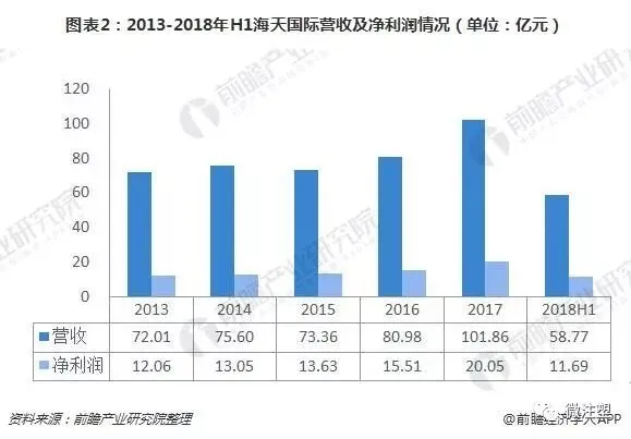 2017年,海天国际营收达到101.86亿元,同比大幅增长25.8%;净利润达到20.05亿元,同比大幅增长29.31%,,两项指标均达到历史新高度。