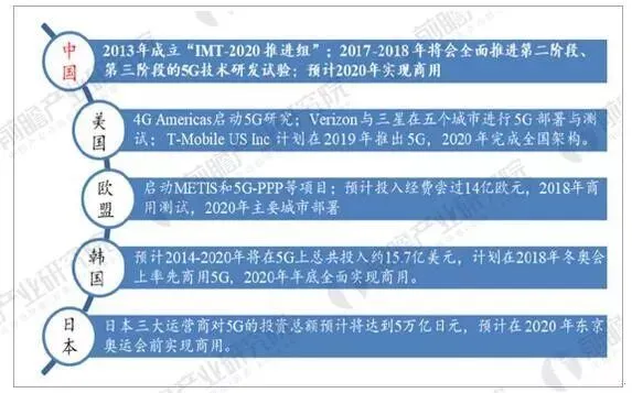 政策方面,中国已经把5G作为国家战略,2017年3月,5G正式写入政府工作报告,我国要从3G跟随,4G并行到5G时代实现全面引领;“十三五”纲要规划指出,要积极推进5G发展,2020启动5G商用。政府支持5G发展,企业加速研发,全球5G商用实现白热化的竞争趋势,5G商用极有可能在2019年年中就全面落地。