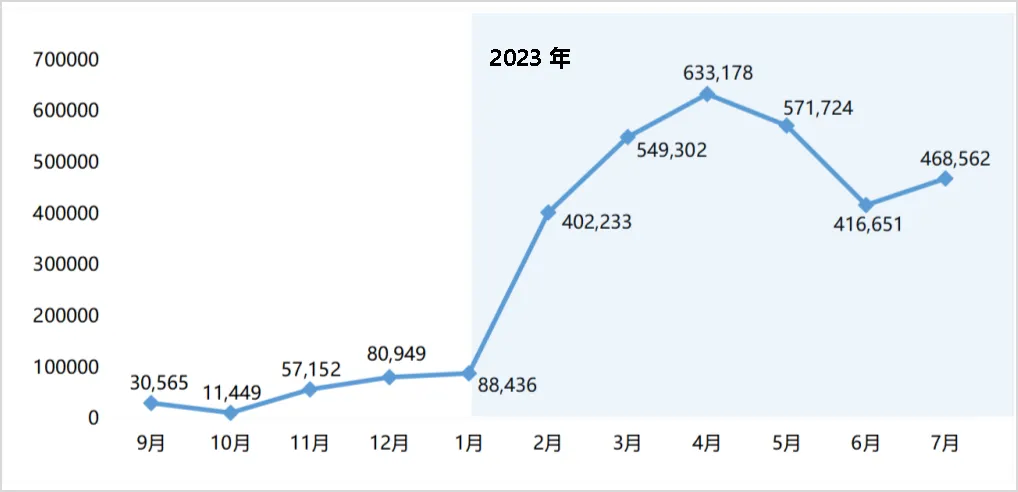 从国内舆论声量来看,2023年至今,全网关于AIGC的讨论量超过313万篇/条。2月初ChatGPT热度蔓延至国内,AIGC相关声量陡增至40.2万篇/条;3月百度推出“文心一言”,带动声量持续升高;4月国家网信办发布《生成式人工智能服务管理办法(征求意见稿)》公开征求意见,引领声量达到峰值63.3万篇/条,之后热度有所降低;7月《生成式人工智能服务管理暂行办法》正式公布,带动声量达到次峰值46.8万篇/条。目前,AIGC热度不减。