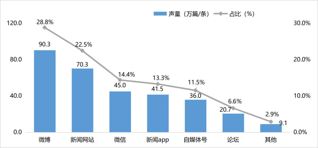 2023年至今的数据显示,用户了解、讨论AIGC相关信息的渠道主要集中在微博和新闻网站,两个渠道的信息量分别为28.8%、22.5%;微信、新闻app、自媒体号三个平台的信息量占比也在10%以上;其他平台声量占比较少。