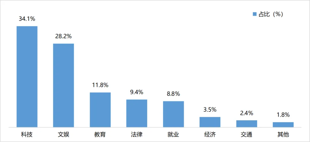 监测时间内,共有170余个与AIGC相关的话题登上微博热搜,累计阅读量近110亿次,涉及科技、文娱、教育等多元领域。整体来看,科技领域有关话题上榜频次较高,占比达到34.1%;其次,文娱类话题数量也较多,占比近三成;教育、法律、就业类话题占比在8%-12%之间。