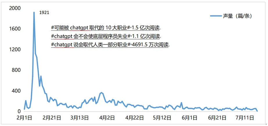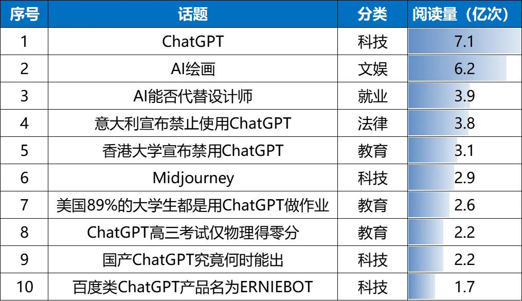 最为舆论关注的问题当属AIGC带来的“失业焦虑”。AIGC可以实现以较低的成本、百倍千倍的生产速度,创造出有独特价值和视角的内容。这意味着,很多传统的内容生产者将面临失业风险。今年,ChatGPT的火爆引发了人们对于此类问题的集中讨论,#可能被chatgpt取代的10大职业##chatgpt会不会使底层程序员失业#等微博话题陆续出现,热门话题阅读量破亿次。