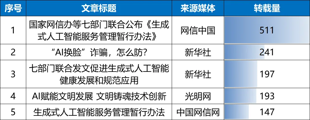 除微博平台外,新闻网站、微信、新闻app、自媒体号热门内容较为相似,以行业最新动态为主,如与《生成式人工智能管理暂行办法》相关的内容热度较高。