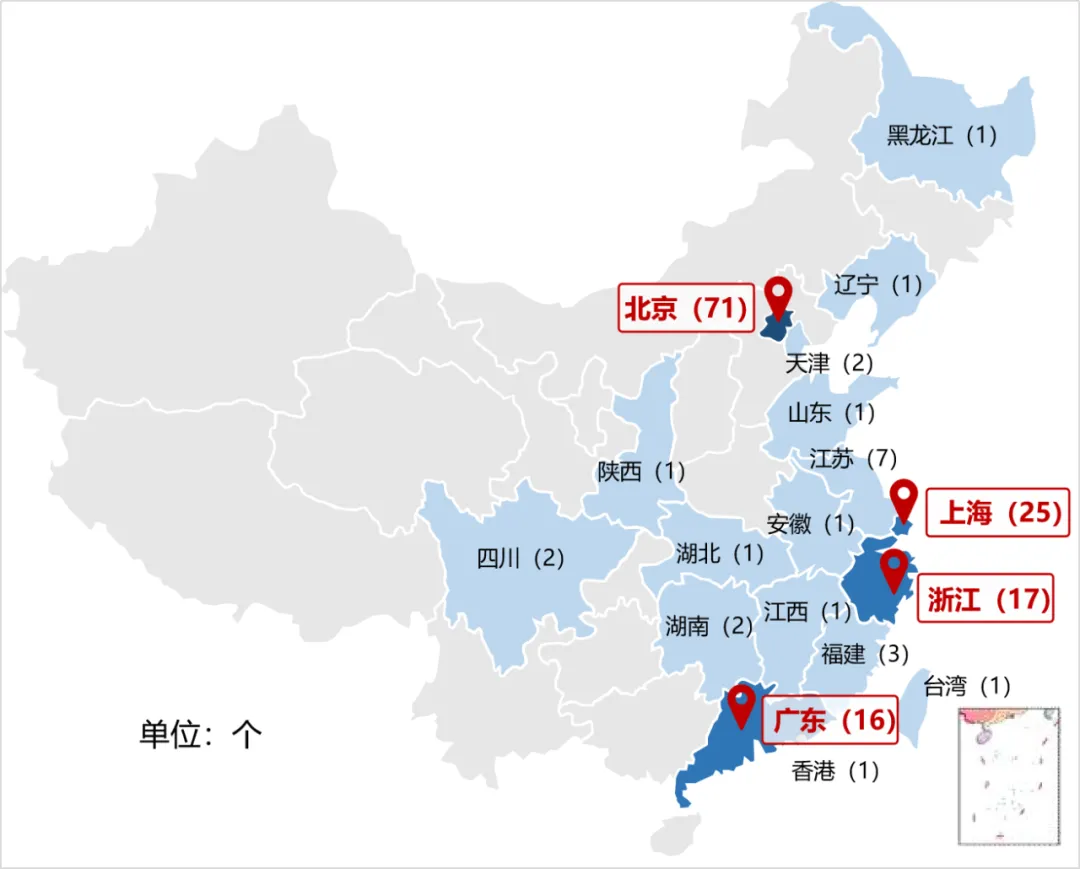 从地域分布来看,相关企业及研究机构分布在18个省市,北京相关的企业及研究机构最多,高达71个;其次上海、浙江、广东相关的企业及研究机构分别达到25个、17个、16个。上述地区是人才和高校分布较多的地区,为AIGC发展提供关键智力要素支撑。