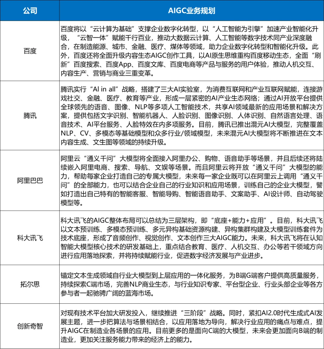 表:中国AIGC领域主要公司业务规划
