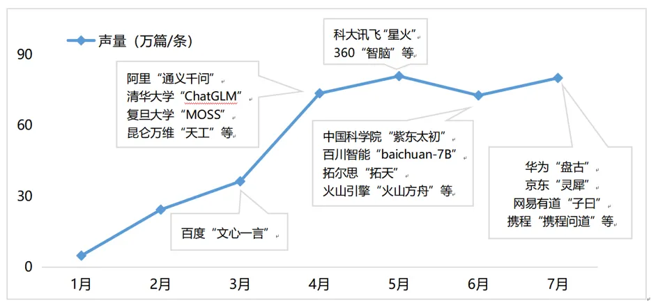 百度发布“文心一言”打响了“百模大战”的第一枪,之后阿里、科大讯飞、华为等越来越多的企业和科研机构投入到这场“战役”之中,7月“2023世界人工智能大会”中,有20余款模型新品在大会上发布或宣布即将发布。2023年至今,“大模型”相关声量超过370万篇/条,并呈现逐渐走高态势。