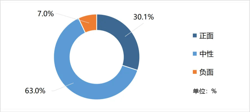 随着AIGC的应用范围越来越广,部分争议性话题也随之出现。对舆论场数据情感进行分析,中性情绪信息占比最多,超过六成;正面情绪信息占比达到三成;负面情绪占比近7%。