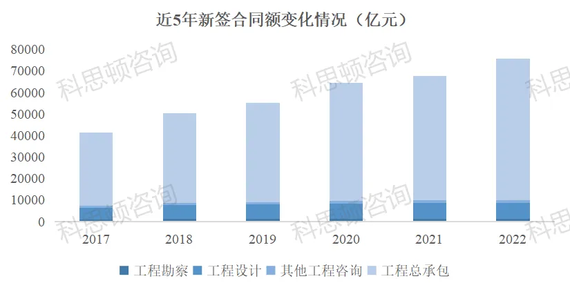2022年,具有勘察设计资质的企业工程勘察、工程设计、工程总承包、其他工程咨询等四项业务新签合同额合计7.6万亿元,同比增长11.7%,增速提高6.7个百分点;四项业务2017–2022年新签合同额年均复合增长12.8%。
