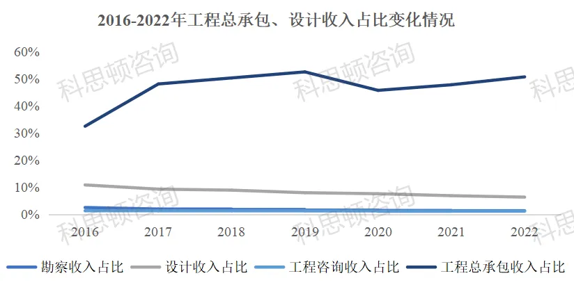 工程总承包收入占比波动上升。从2016–2022年勘察设计行业业务结构变化来看,设计业务占营业收入比重由2016年10.8%逐年降至2022年的6.3%;工程总承包业务占营业收入比重由2016年32.4%升至2019年52.4%成为第一主营业务,但2020年又降至45.6%,甚至低于2017年占比,2021年起回升,2022年回升至50.6%。