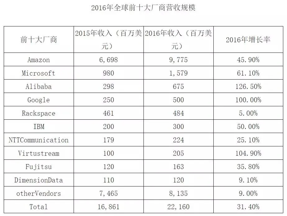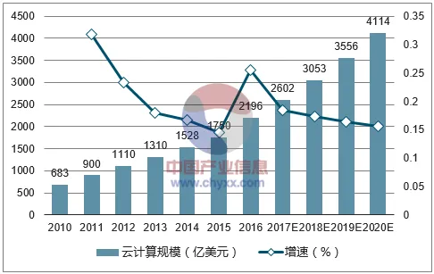 全球云市场规模持续高增长。全球公有云市场规模从2010年的683亿美元增长至2016年的2092亿美元,年复合增长率高达20.51%。Gartner最新报告显示,2017年全球公有云市场规模将达到2602亿美元,较去年增长18.5%,预计到2020年全球公有云市场规模将达到4114亿美元,2018-2020年年复合增速将达到16.5%。随着AI的采用和物联网在企业及初创企业的应用,据预测Iaas(基础设施即服务)的增长空间较高,主要受到基础设施迁移到云端的额外需求及计算密集型工作的需求增加所带动。2016年企业服务17%的总市场营收转移到了云服务,到2021年将增长到28%。