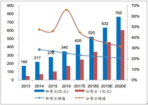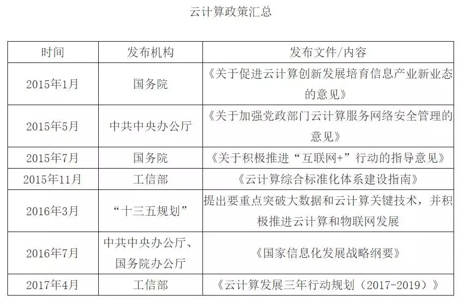 国家“十二五”、“十三五”规划都明确提出将云计算作为未来科技发展的重要领域,近几年支持云计算发展的相关政策密集出台。2017年4月,工信部发布《云计算发展三年行动计划(2017-2019)》,提出到2019年我国云计算产业规模达到4300亿元,云计算服务能力达到国际新进水平,云计算在制造、政务等领域的应用水平显著提高,涌现2-3年在全球云计算市场中具有加大份额的领军企业。2015年末中国云计算产业规模约1500亿元,意味着2016-2019年年复合成长30%。此外,各级部门明确提出政府部门、银行等金融机构业务逐步迁移至云端,意味着将为私有云厂商带来大量订单,近两年阿里云、腾讯云、运营商纷纷0元中标地方政务云,希望借此获得项目的运营权,从日后的数据经营中长期获利。