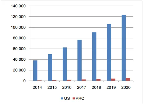 目前我国云计算市场只占全球市场总规模的5%,这与我国人口规模、商业规模、GDP占全球份额极不匹配。与美国比,在公有云市场上,中国与美国有至少五年的差距,美国云市场已经进入成熟期,中国则仍处于初始扩张阶段。2016年中国云计算整体市场规模达514.9亿元,整体增速35.9%,大幅高于全球平均水平。其中私有云市场规模344.8亿元,同比增长25.1%;公有云服务市场整体规模约170.1亿元,同比增长66.0%。预计2017-2020年中国云计算市场仍将保持高速增长,到2020年市场规模达到1366亿元,其中IaaS、SaaS是增长驱动力。