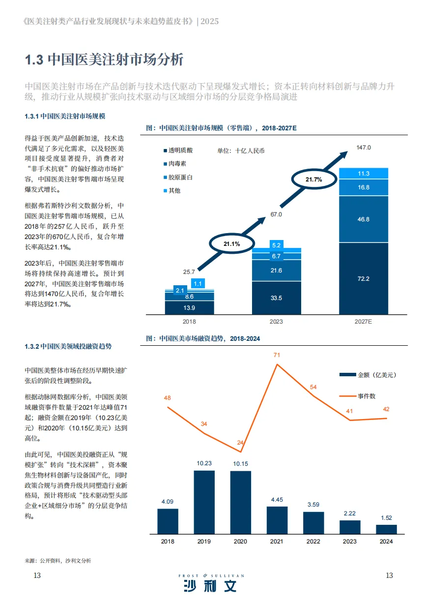 高速增长: 中国医美注射零售端市场规模从2018年的257亿人民币增长至2023年的670亿人民币,复合年增长率(CAGR)达21.1% 。