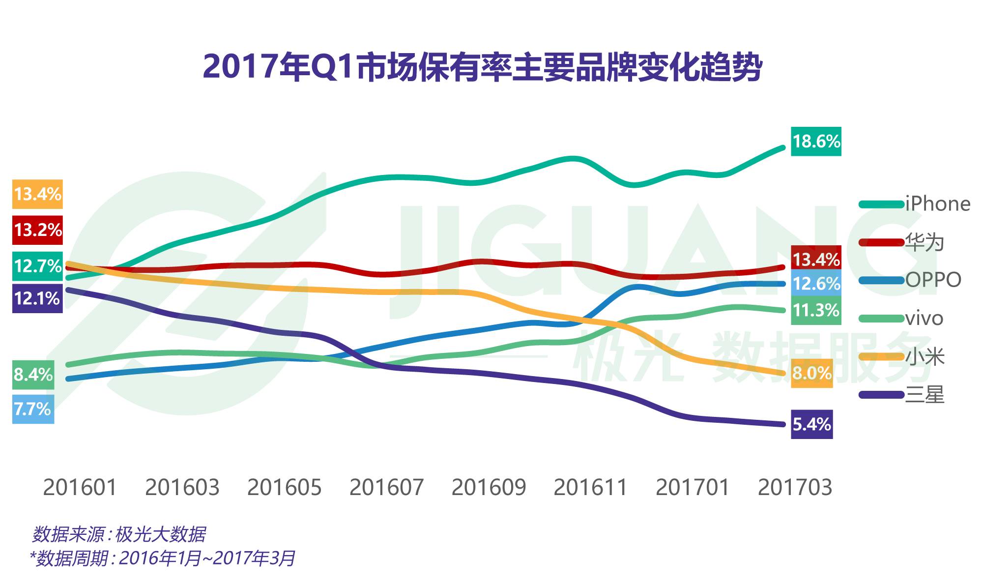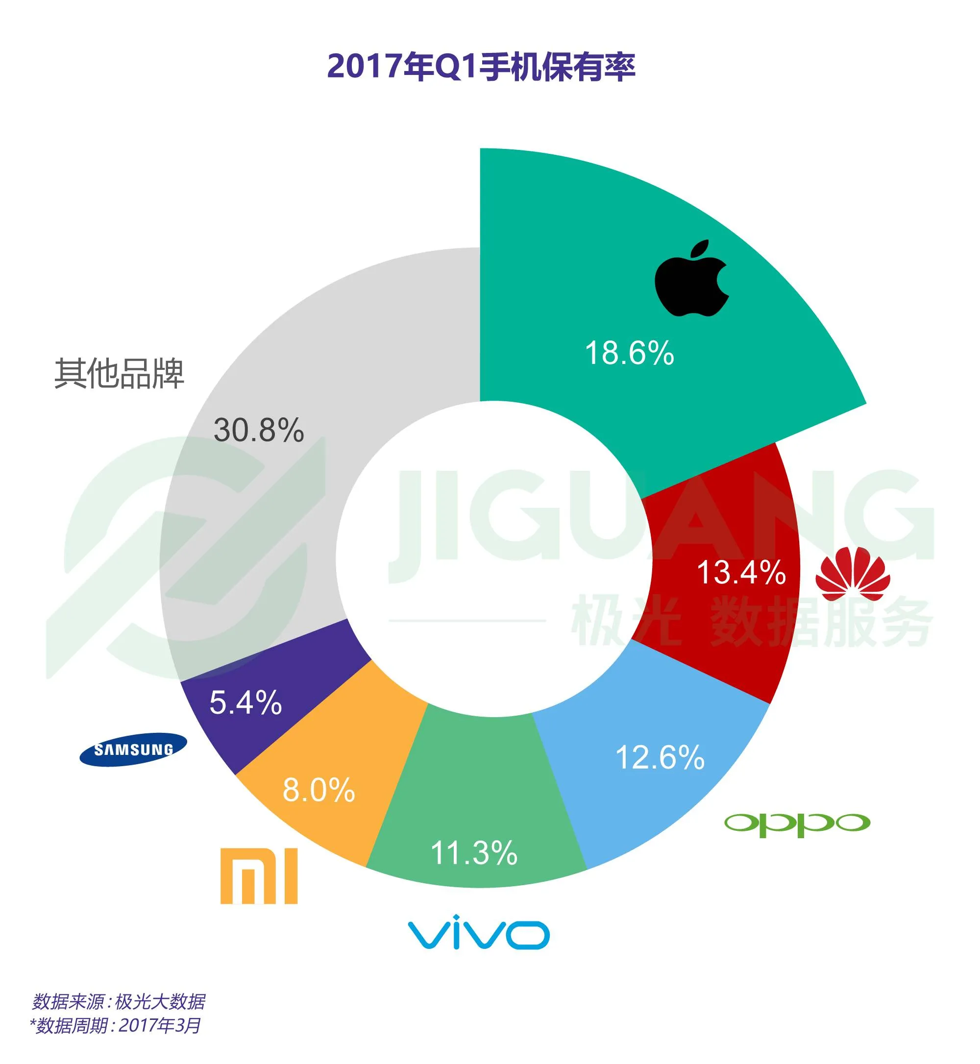 极光大数据显示,2017年Q1手机保有率top5品牌依次为苹果、华为、OPPO、vivo和小米,曾经的安卓机皇三星依旧难掩颓势, 连续三个季度跌出top5