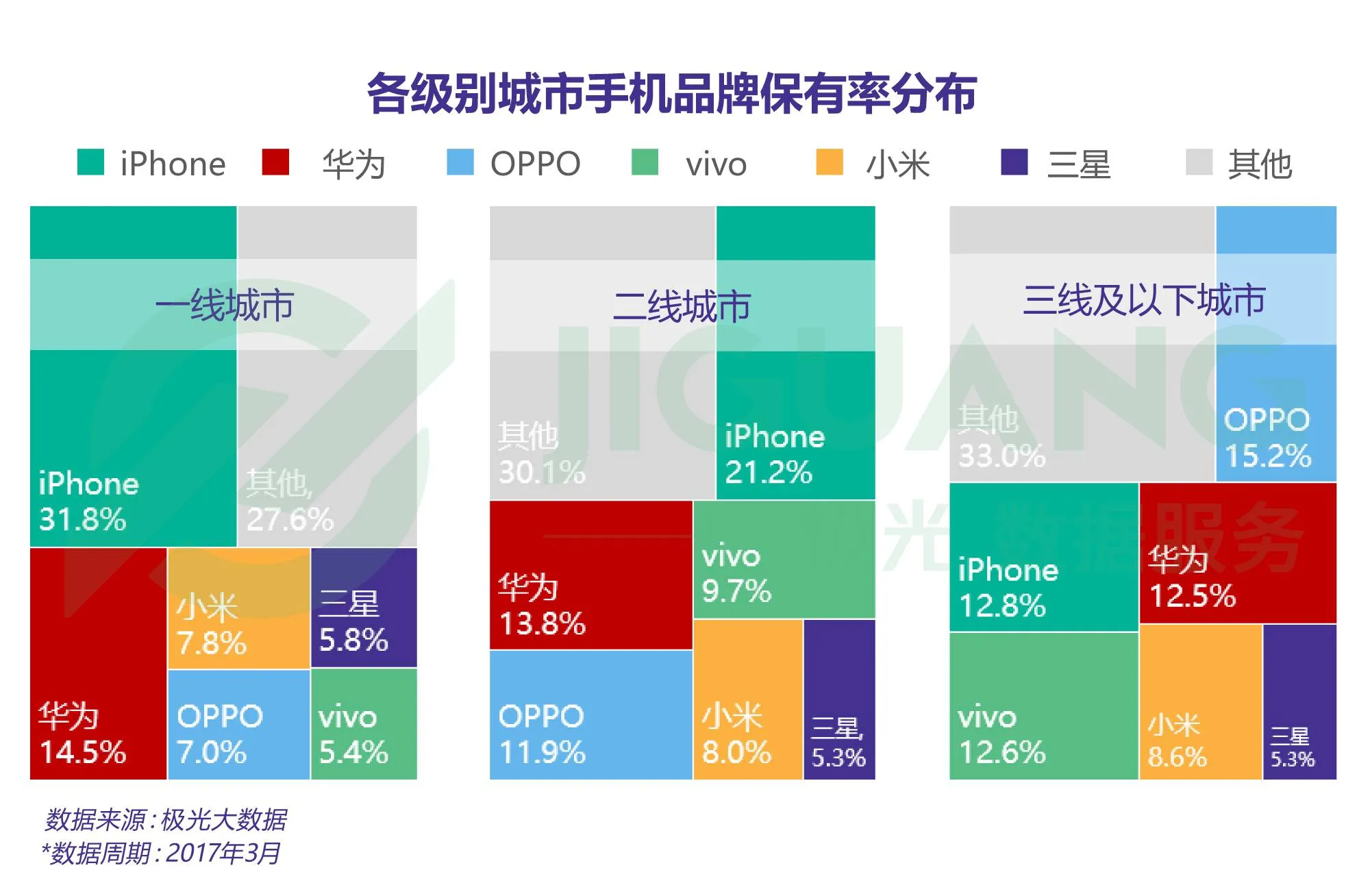 iPhone保有量称霸一二线城市,OV在三线及以下城市表现出色