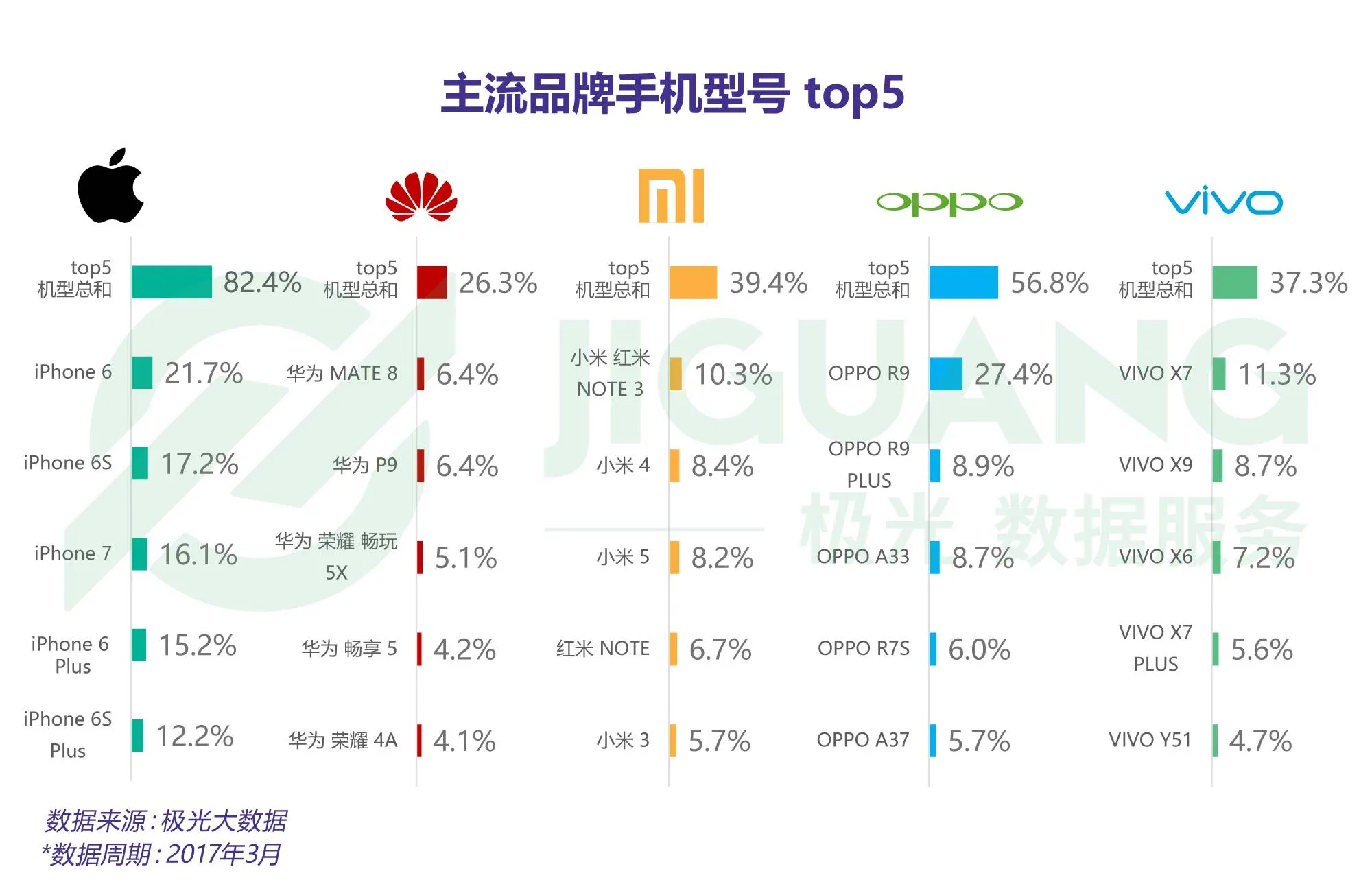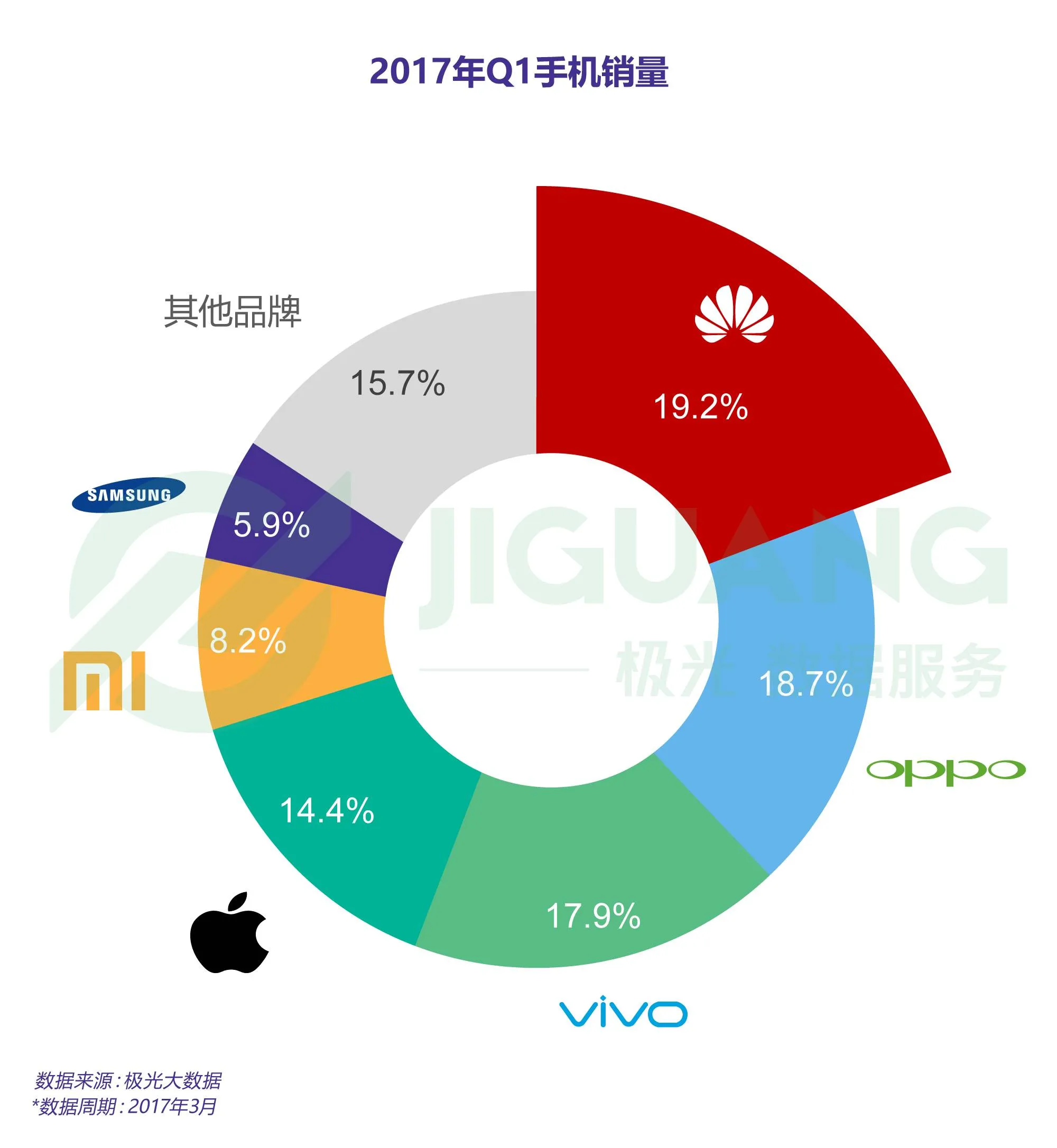 极光大数据显示,2017年Q1销量top5品牌依次为华为、OPPO、vivo、苹果和小米,排名与上季度一致