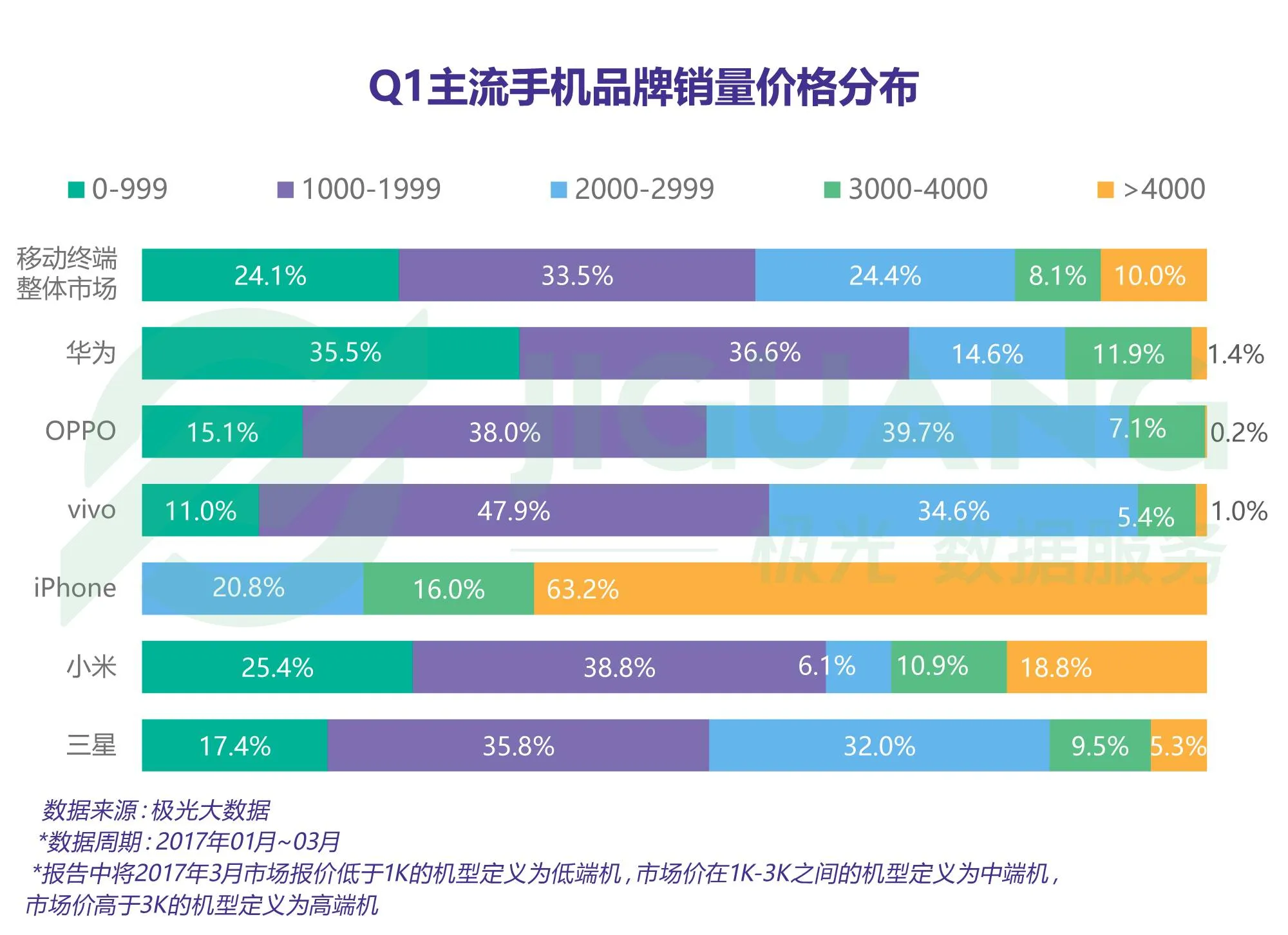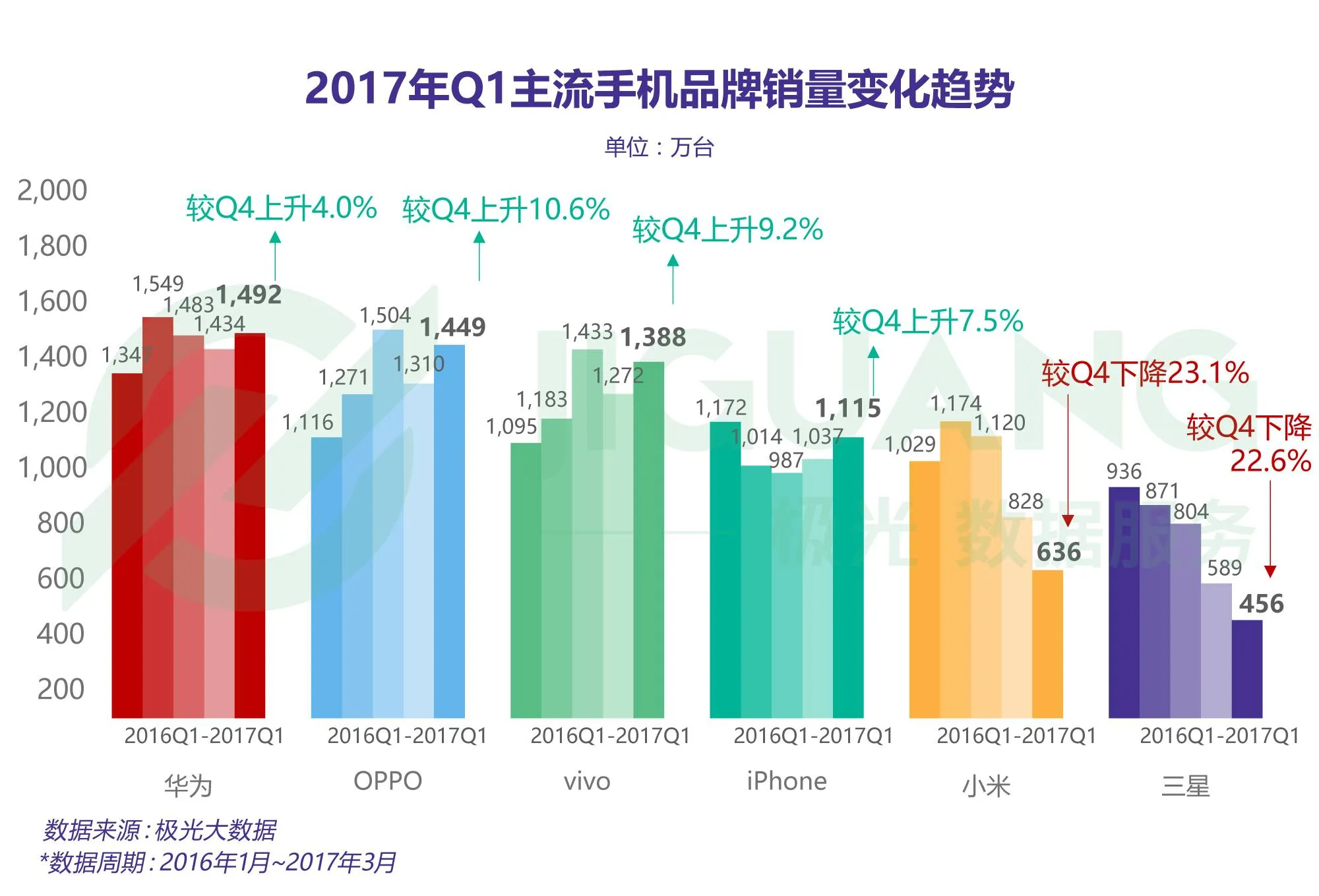 极光大数据显示,华为、OPPO、vivo和iPhone在2017年Q1的销量均有不同程度的上升,升幅在4%-10%之间