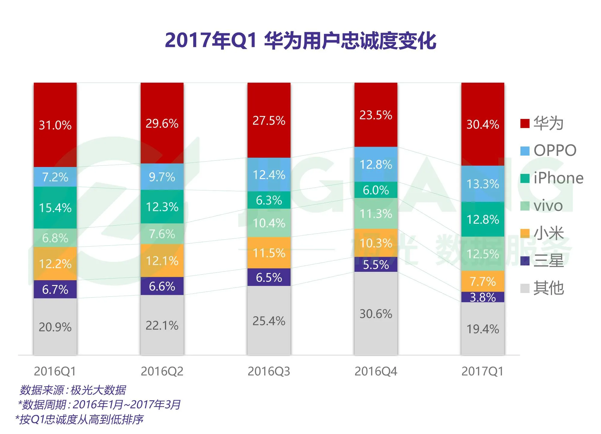 华为的用户忠诚度较Q4相比大幅提升至30.4%