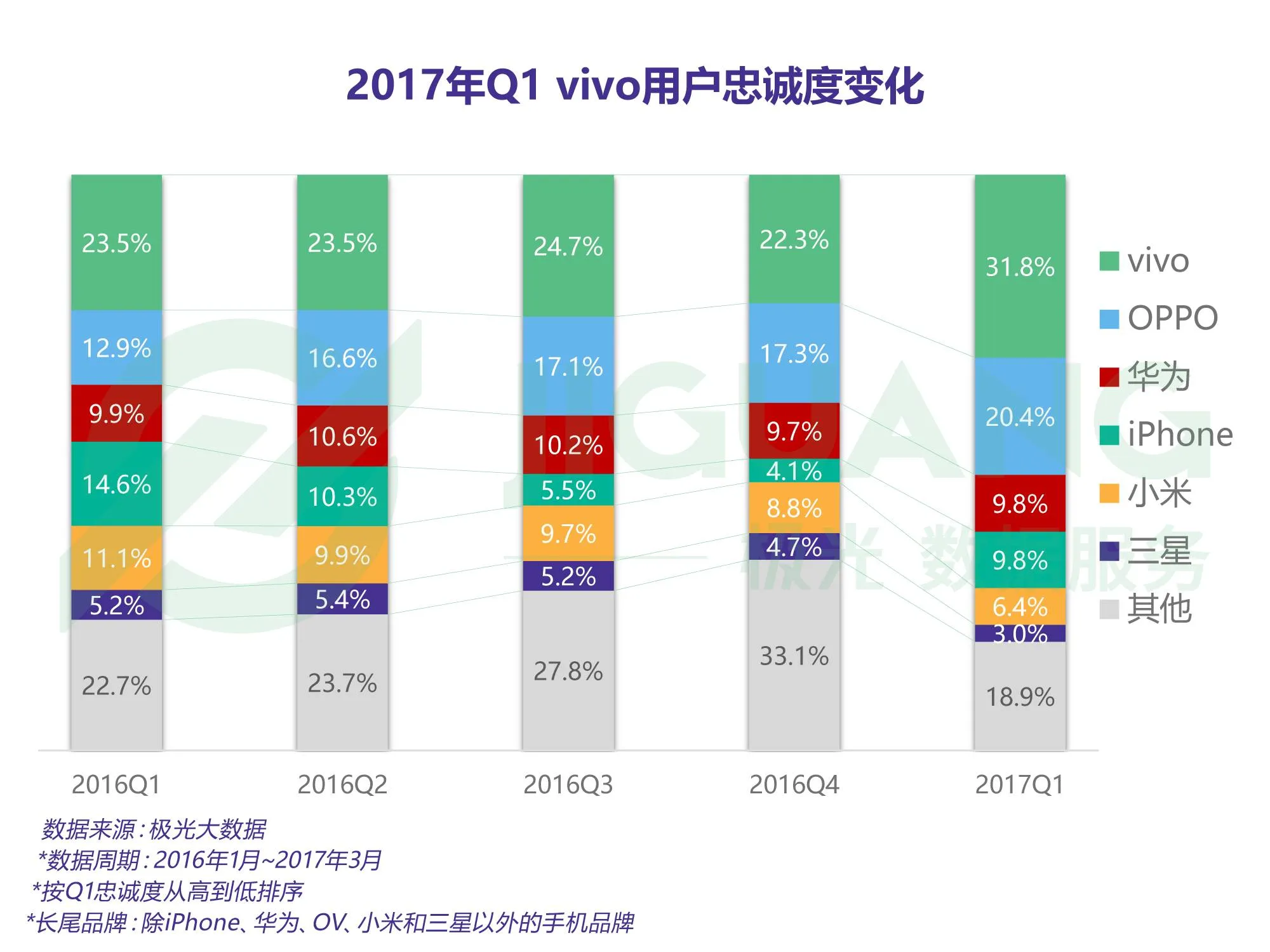 极光大数据显示,长尾市场对vivo的影响在Q1有所削弱,只有18.9%的vivo换机用户会选择长尾品牌*