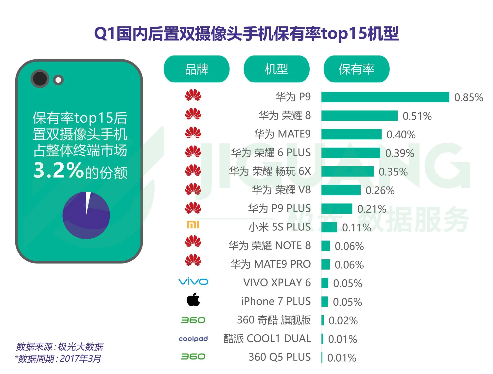 双摄手机市场华为P9领跑,华为荣耀系覆盖细分市场最大用户量