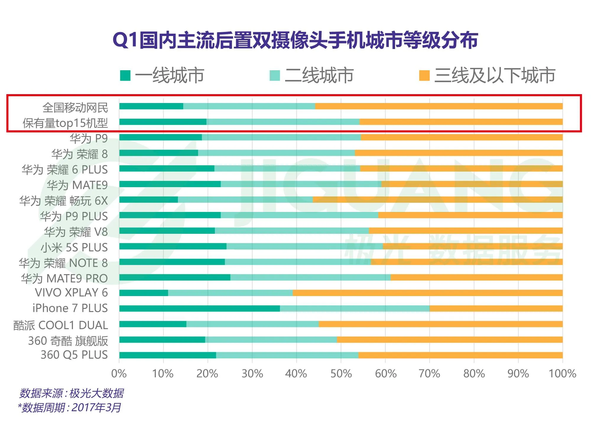 极光大数据显示,54.2%的后置双摄像头手机用户来自一二线城市,较全国移动网民的一二线城市用户占比高10%
