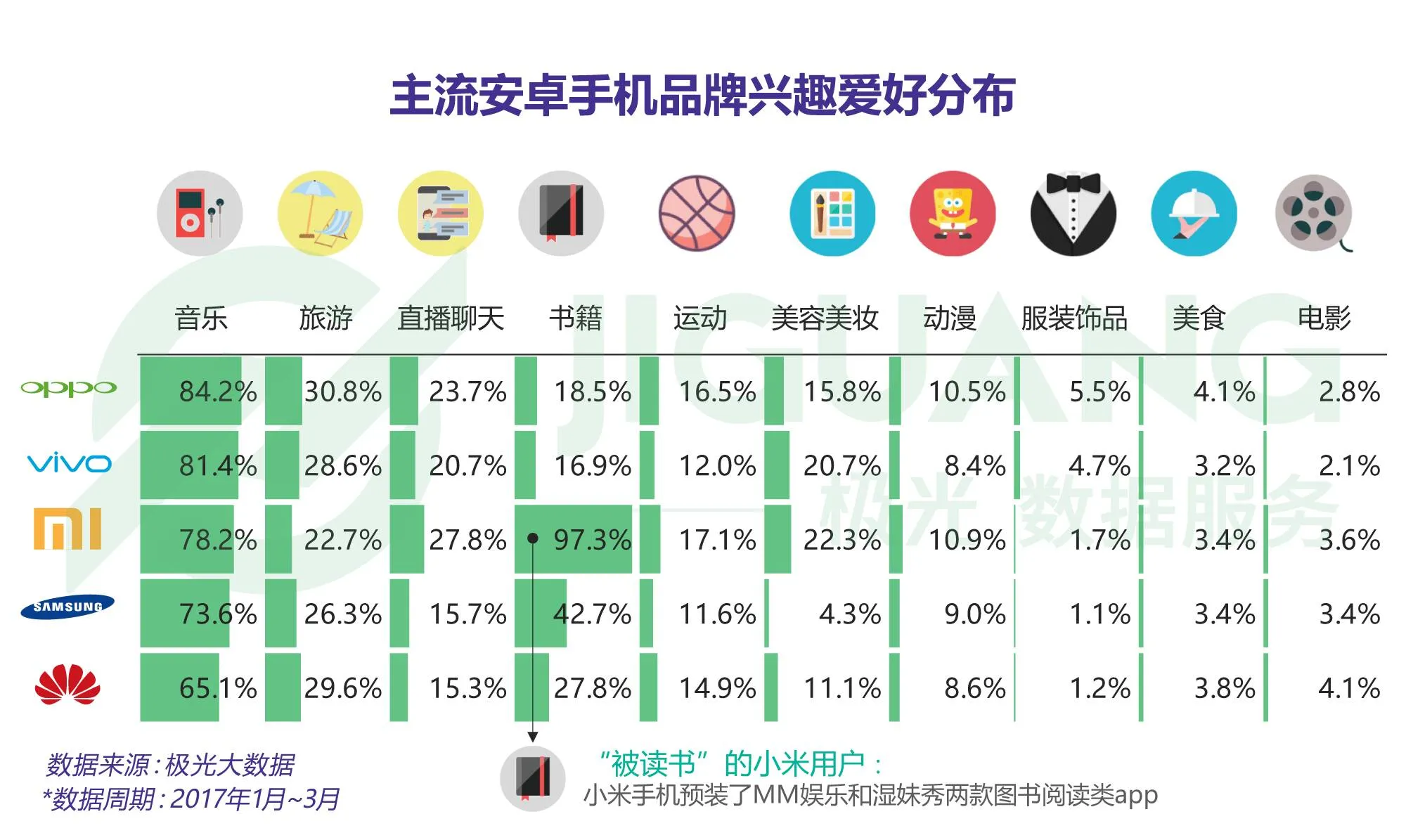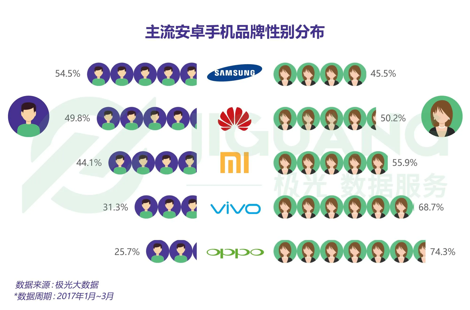 极光大数据显示,三星、华为、小米用户的男女比例约为1:1,而OPPO和vivo的性别偏向性显著,女性用户约占七成